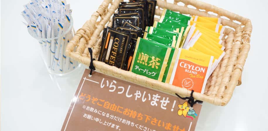 各館のロビーに、お茶やコーヒーのパックをご用意しております。